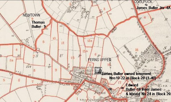 The local source of information about the Coolpuck and Newtown Butlers claims his great grandmother was a Butler born c.1836 and that she was related to one of the 1798 rebels. This would appear to indicate that Laurence Butler may have had sons, possibly George and Edward, who may have settled in Ferns resulting in the descendants known as the Newtown and Coolpuck Butlers, although Y-DNA evidence indicates that Laurence was not related to the Coolpuck Butlers.